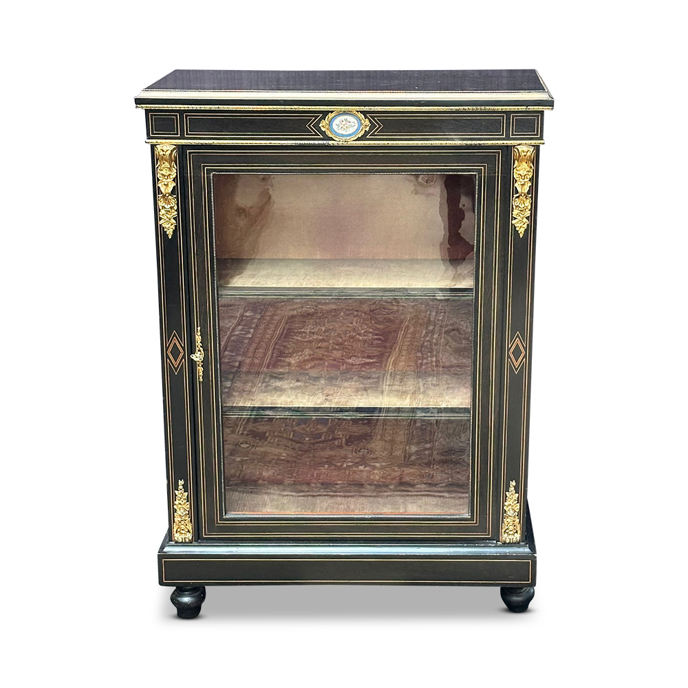 Crafted circa 1890, this cabinet features a single glazed door with 3 shelves within, perfect for displaying your porcelain collection, books, or other treasures. It has been beautifully ebonised and features decorative ormolu mounts and satinwood inlays. Edges have been gilt and add that extra “bling” to the piece. A lovely addition is the handpainted floral plaque which adorns the top centre of the cabinet. The cabinet rests on round feet.
