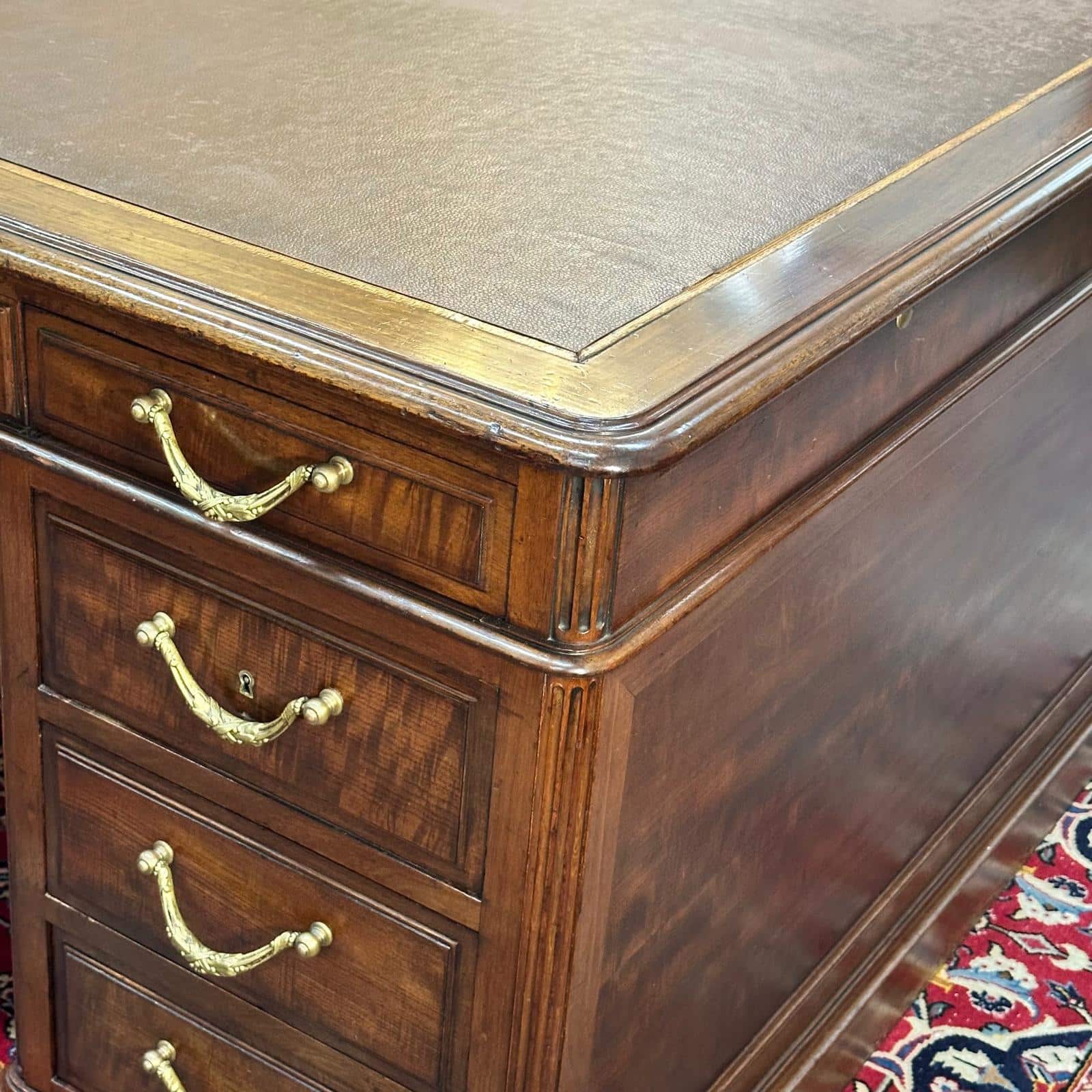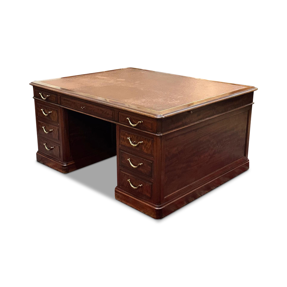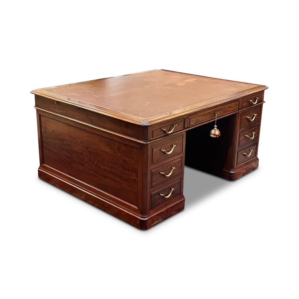 This grand desk is the ultimate in office luxury and style. Crafted from warm mahogany, it has the most beautiful patina which gives it such a rich character. The desk features a plethora of storage with its 18 drawers – 9 to each side of the desk. The central drawers are both lockable with the included original keys. The drawers feature elegant ormolu swag handles.