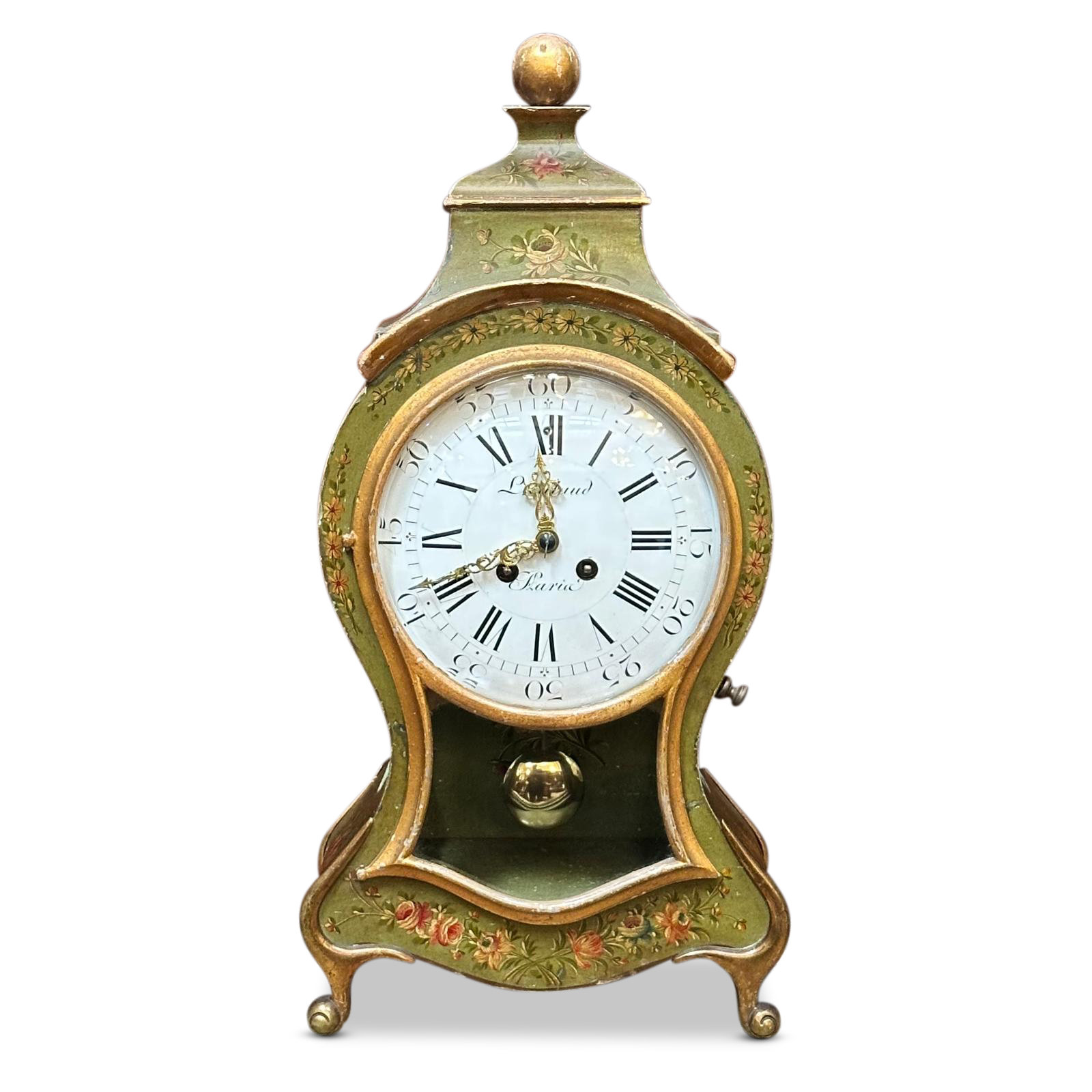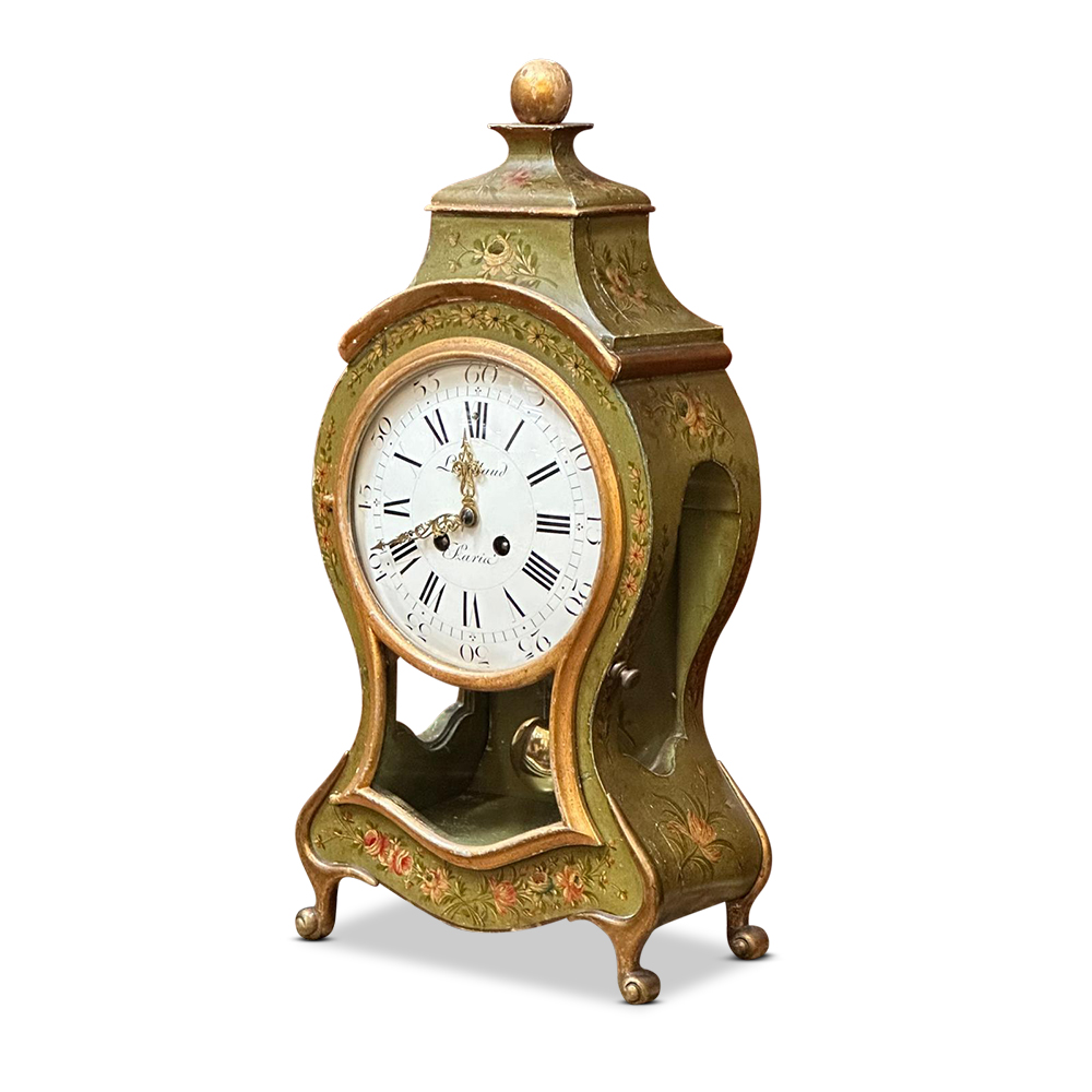 By Parisian clockmaker Lieutaud, this pretty piece features a green metal outer casing which has been hand painted with floral embellishments. It’s graceful curved shape finishes at the top with a round gilt crowning finial. The clock face is both clear and beautiful and can be seen from across the room. It displays both roman numerals for the hours, and Arabic numbers for the minutes.