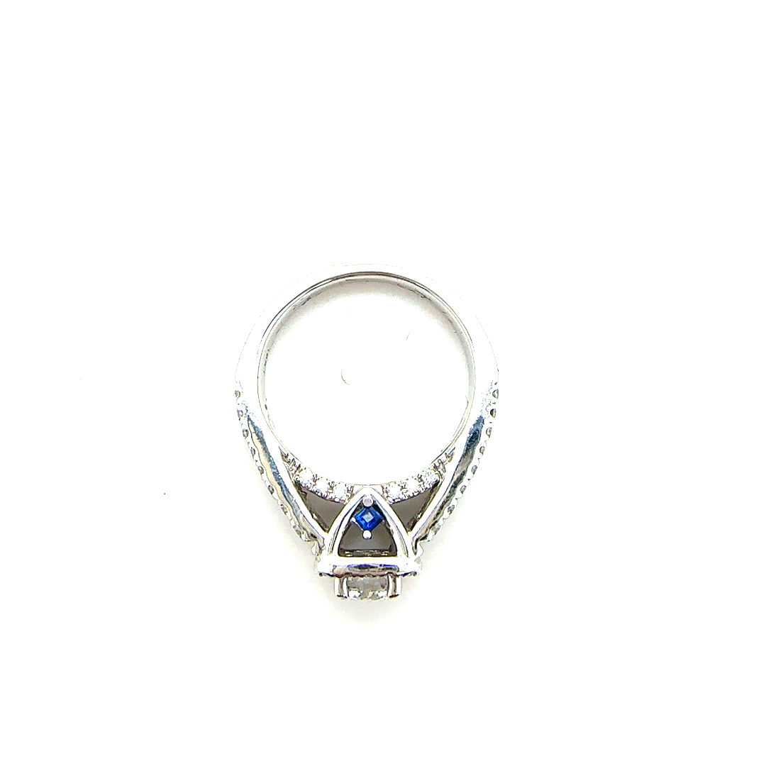 The central diamond is set high on the 18ct white gold band. It is surrounded halo style, with smaller diamonds, and the band is encrusted with baguettes and brilliant cut diamonds. On both sides, two petite sapphires adorn the ring for your “something blue”.