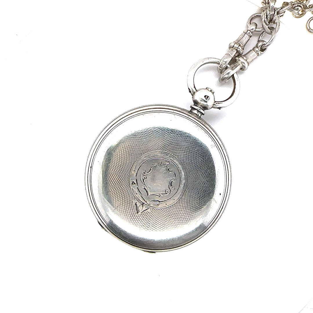 Introducing a beautiful English sterling silver open faced pocket watch and fob chain c.1871.