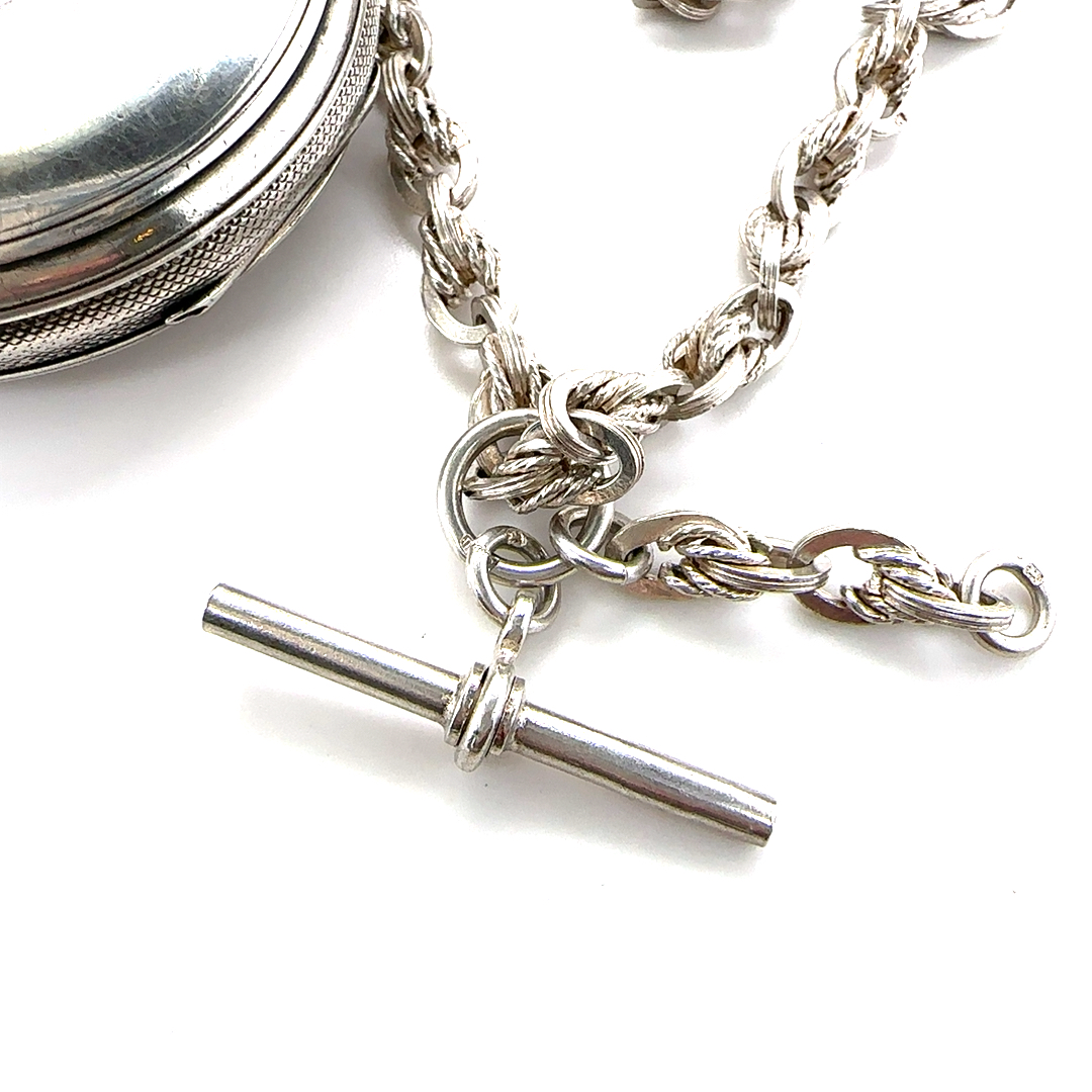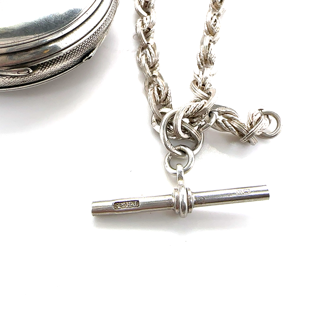 Accompanying the watch is a substantial sterling silver fob chain, complete with T-bar and swivel clasps, perfectly suited for wear with a waistcoat and adding both practicality and period charm.