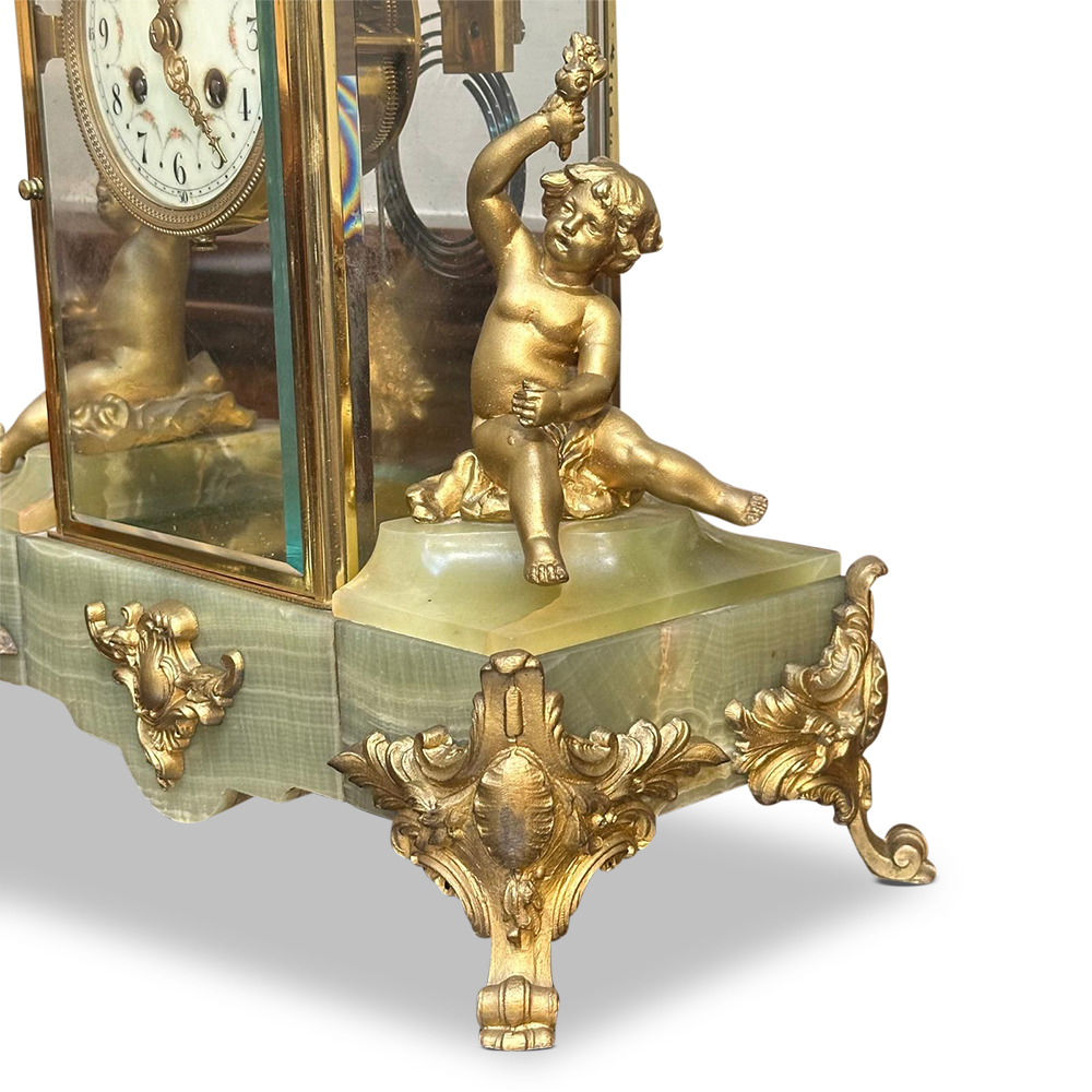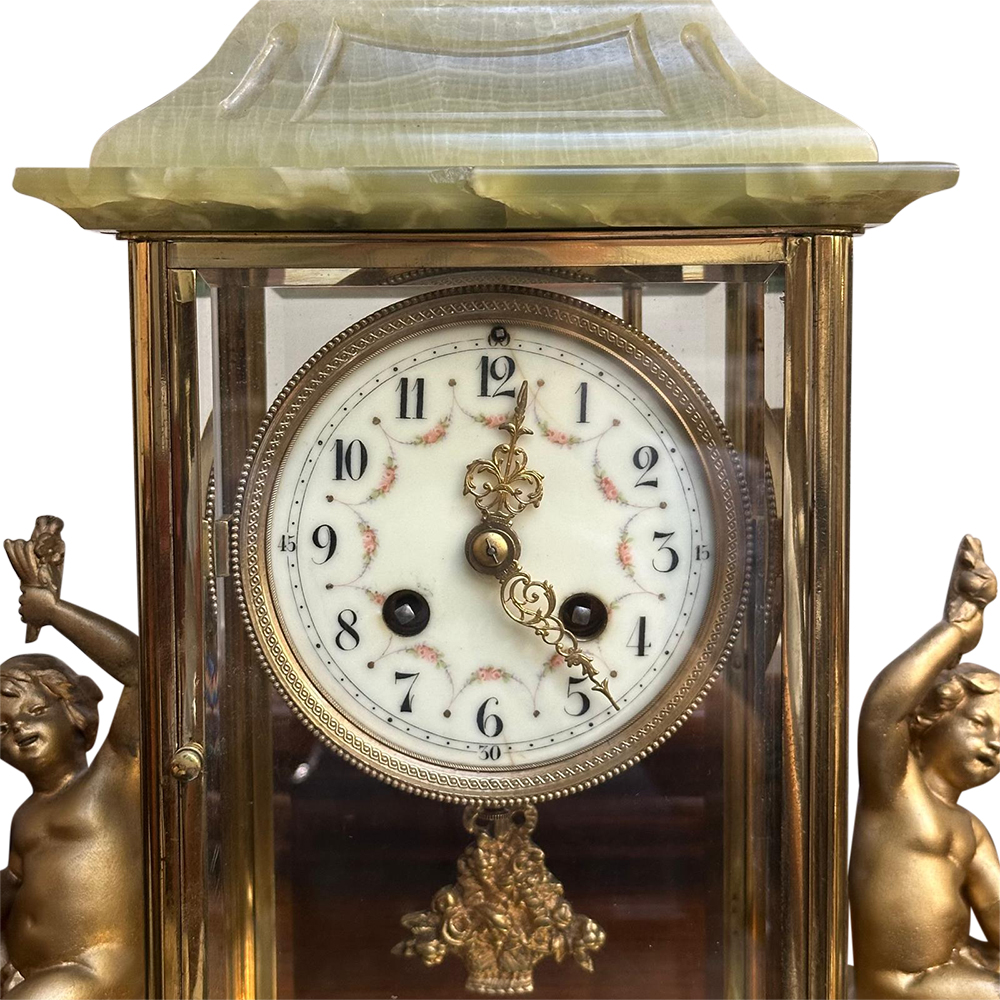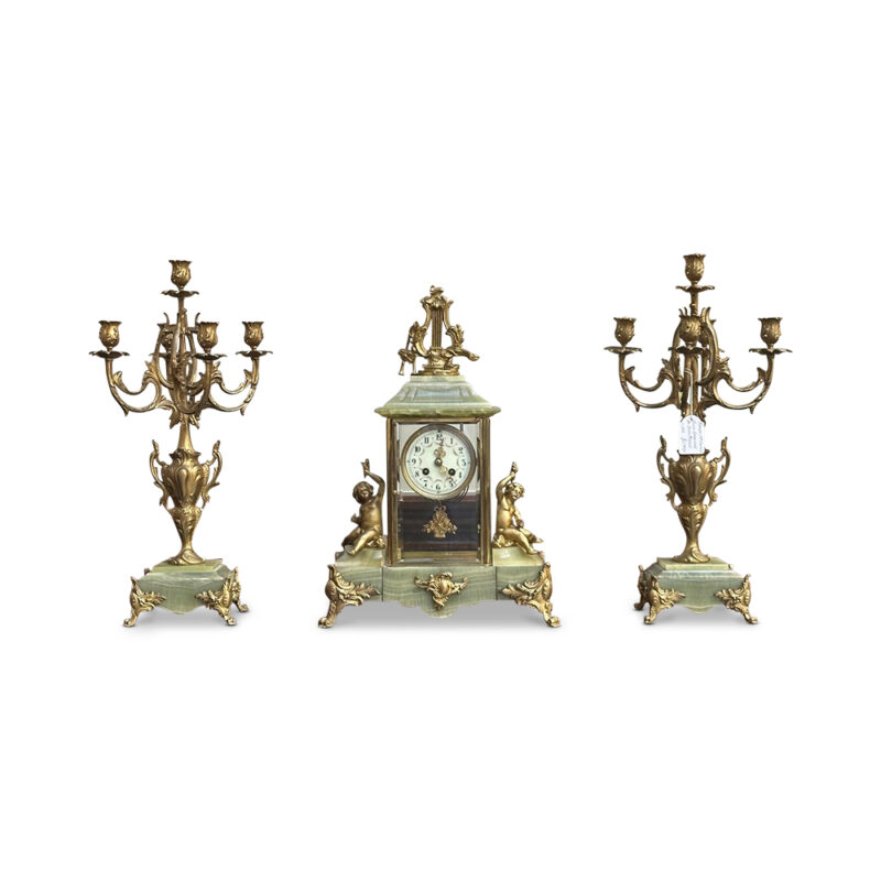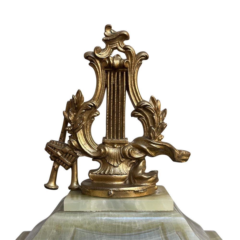 Crafted with stunning green onyx, this clock is a beautiful addition to traditional and contemporary decors alike. The milky onyx has a beautiful contrast with the ormolu mounts which adorn the clock and its matching candelabras on either side.