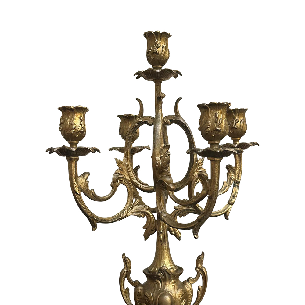 The dial is quintessential French prettiness with its floral swag details, and is clear enough to be read from across the room. The clock is flanked by two cupids on each side, and the candelabras consist of 4 branches each, and a fifth candle holder to the centre.