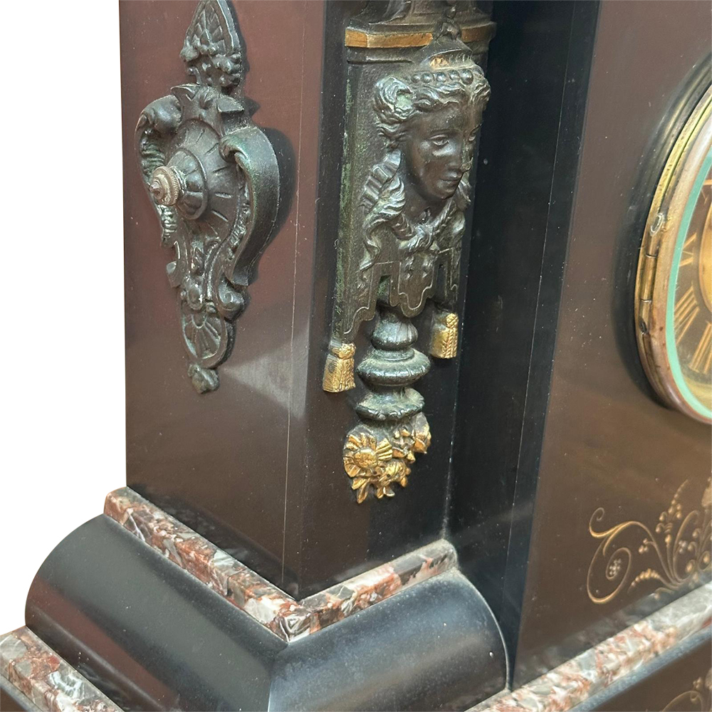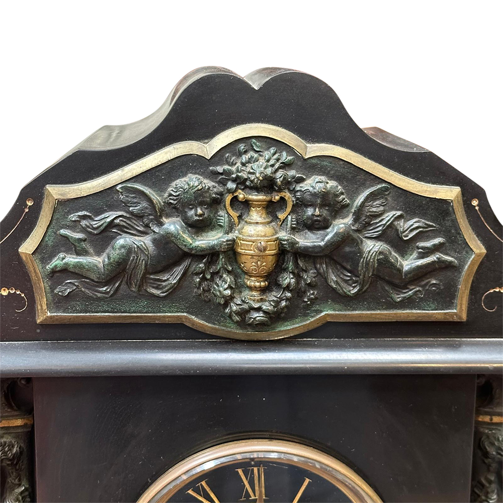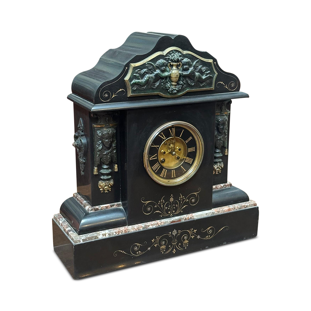 Made from heavy black slate, this lovely clock features two decorative cupids on columns, flanking the dial. There are further cast and gilt embellishments around the clock face. Part of the base reveals a beautiful rouge marble peeking out which adds a great touch to the piece.