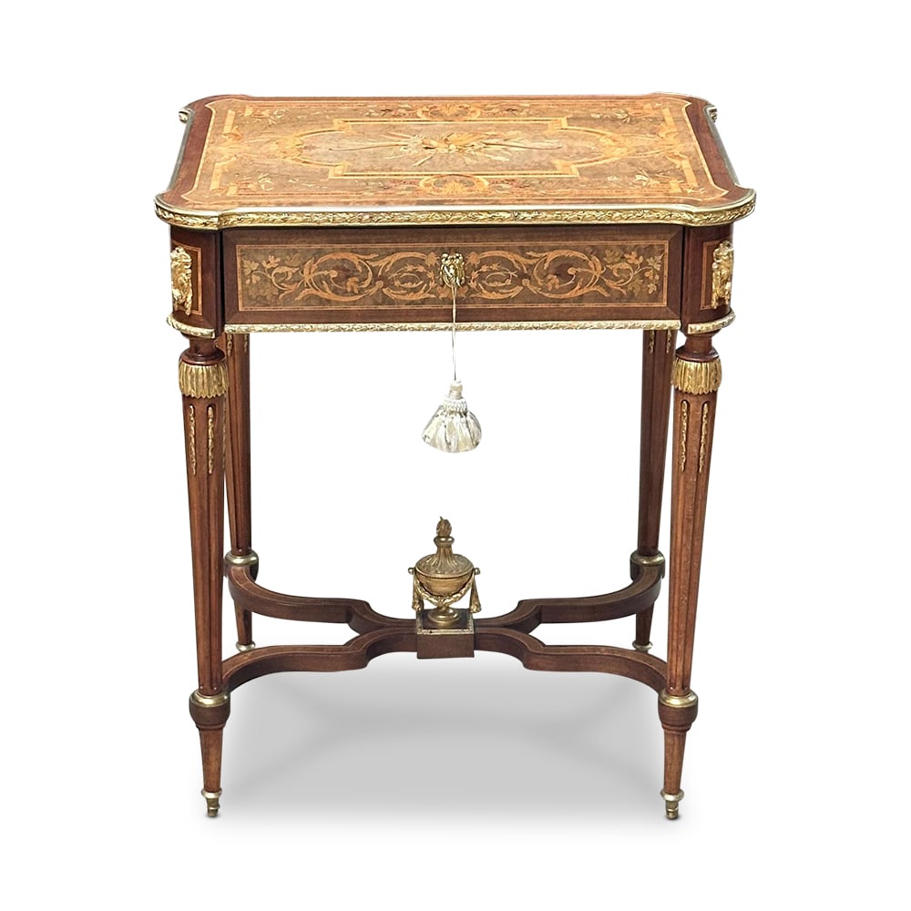 Raised on elegant turned and fluted legs, united by a shaped stretcher and centred with a finely cast urn, the table demonstrates a harmonious balance of structure and ornament. Every element, from the precision of the marquetry to the quality of the mounts, speaks to its world-class standard.