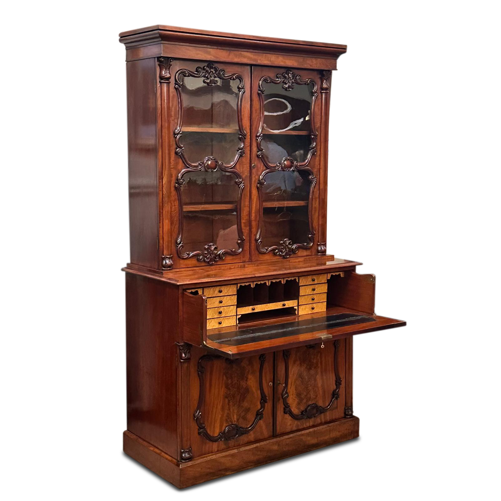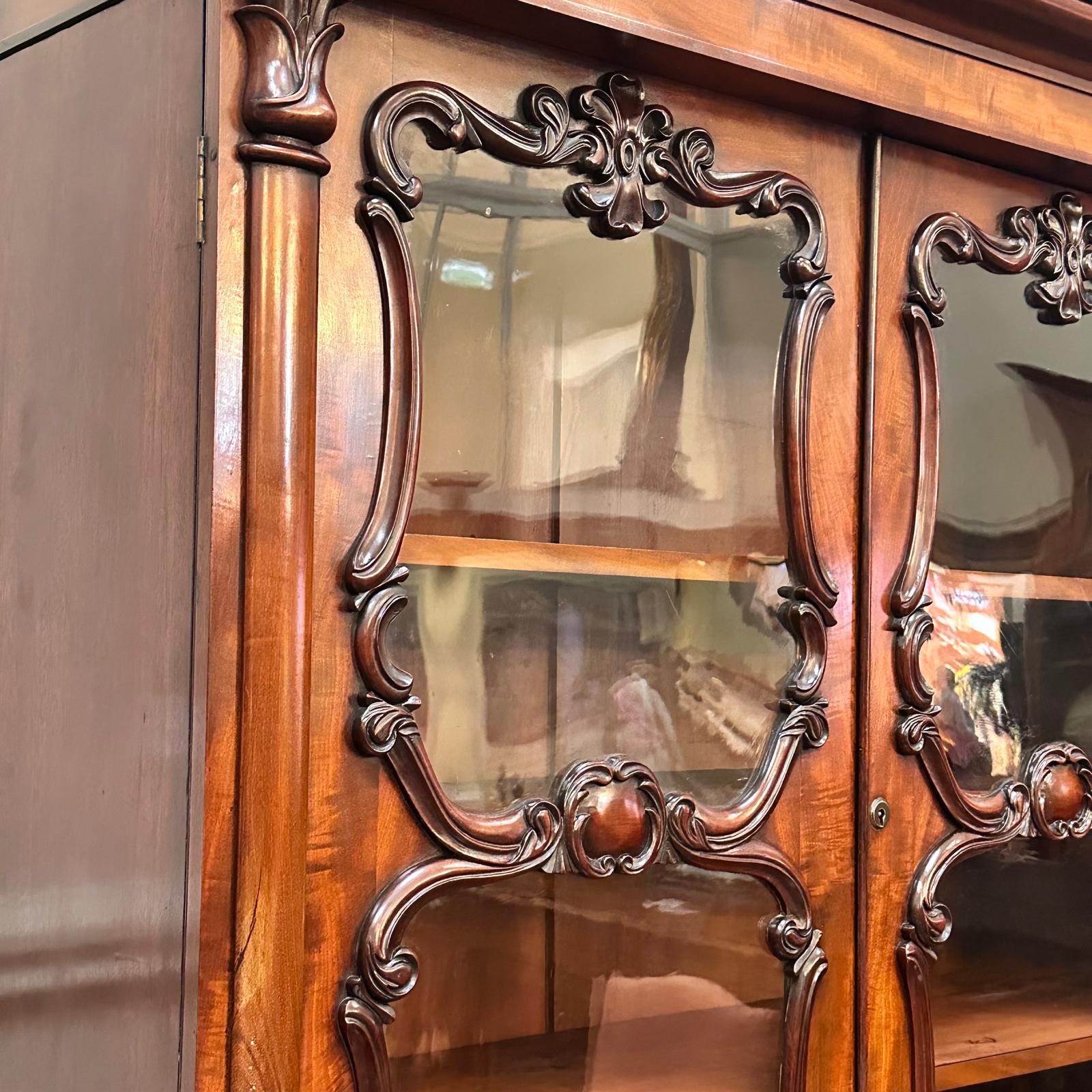 With those quintessential William IV scrollwork carvings, this piece is both functional and beautiful. Made from stunning Cuban mahogany, the warmth, richness and grain of the timber is second to none. The upper section has 2 glazed doors with storage for your book collection. The lower cupboards offer plenty of storage for other items.