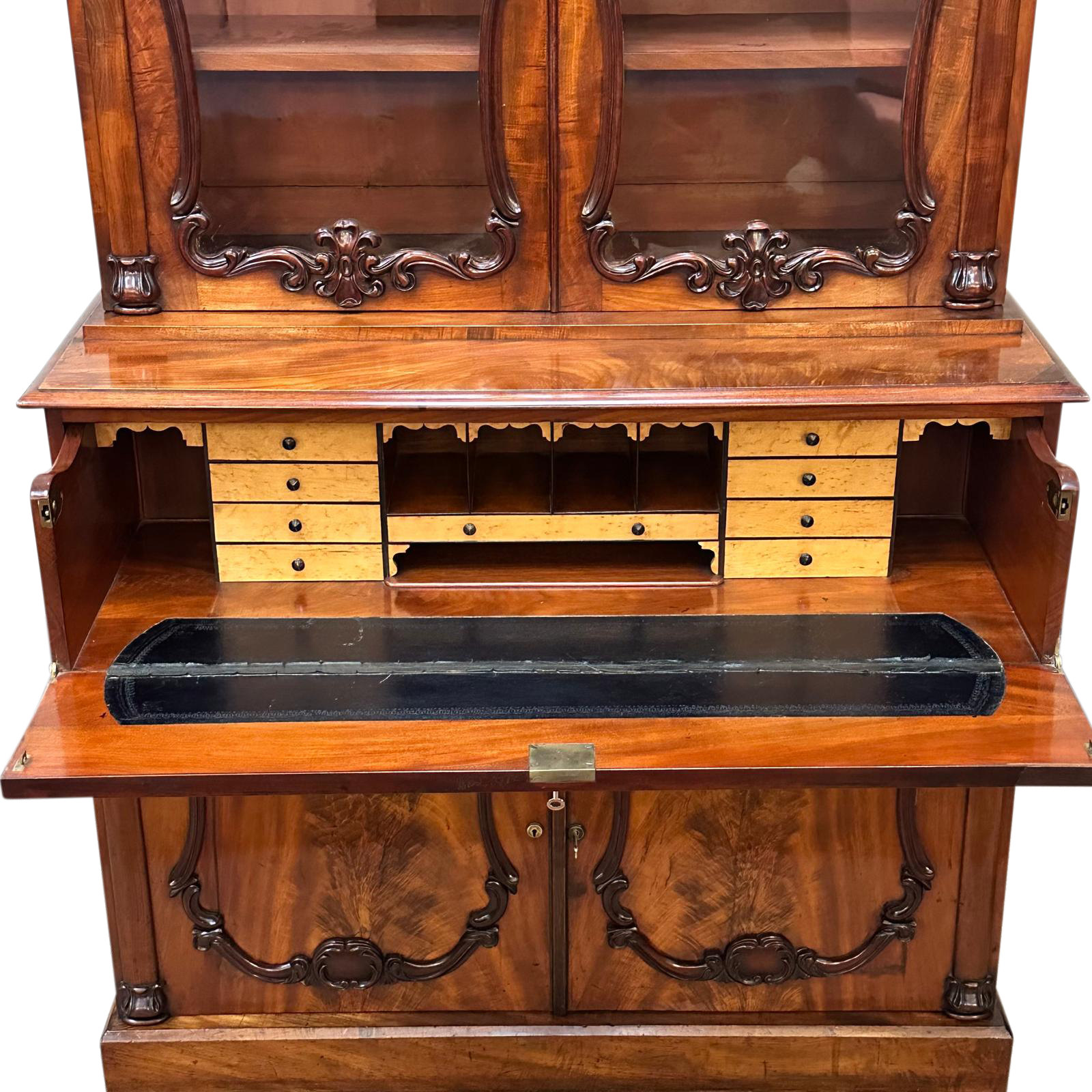 The full width secretaire opens to reveal a fully fitted interior with lots of storage options for stationery and paperwork. The desk top has a black tooled leather top with gilt keywork surrounding the edges. All original keys are included with the piece.