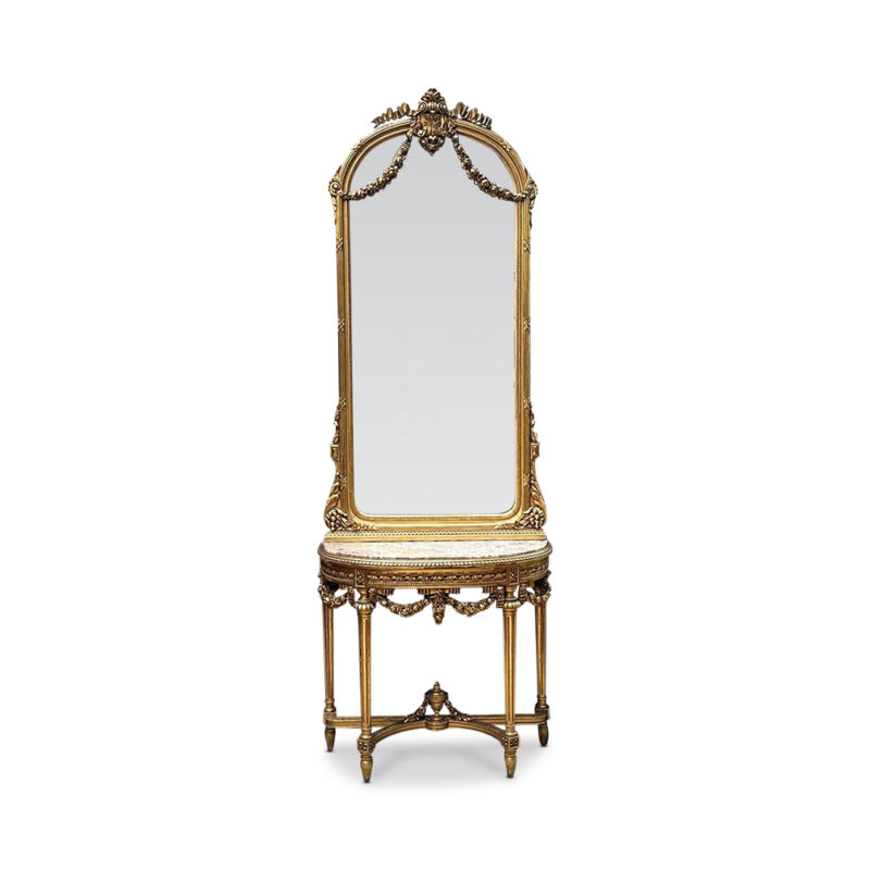 Superb 19th century French gilt half round rouge marble top console table and mirror c.1870